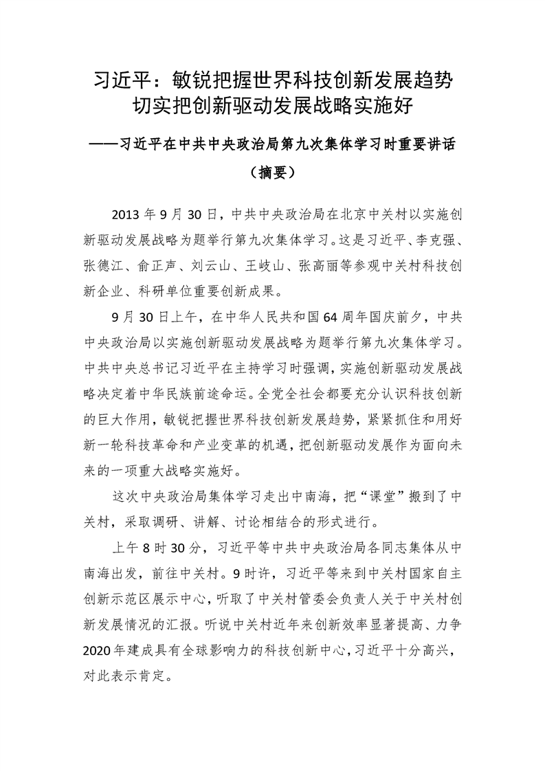 习近平:敏锐把握世界科技创新开展趋势 切实把创新驱动开展战略实施好——习近平在中共中央政治局第九次集体学习时重要讲话