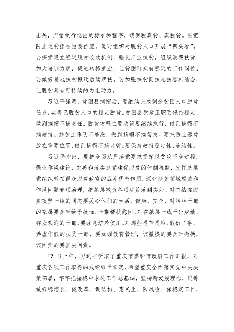 统一思想一鼓作气顽强作战越战越勇 着力解决“两不愁三保障”突出问题——习近平在重庆考察并主持召开解决“两不愁三保障”突出问题座谈会上的讲话精神