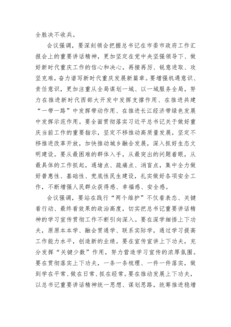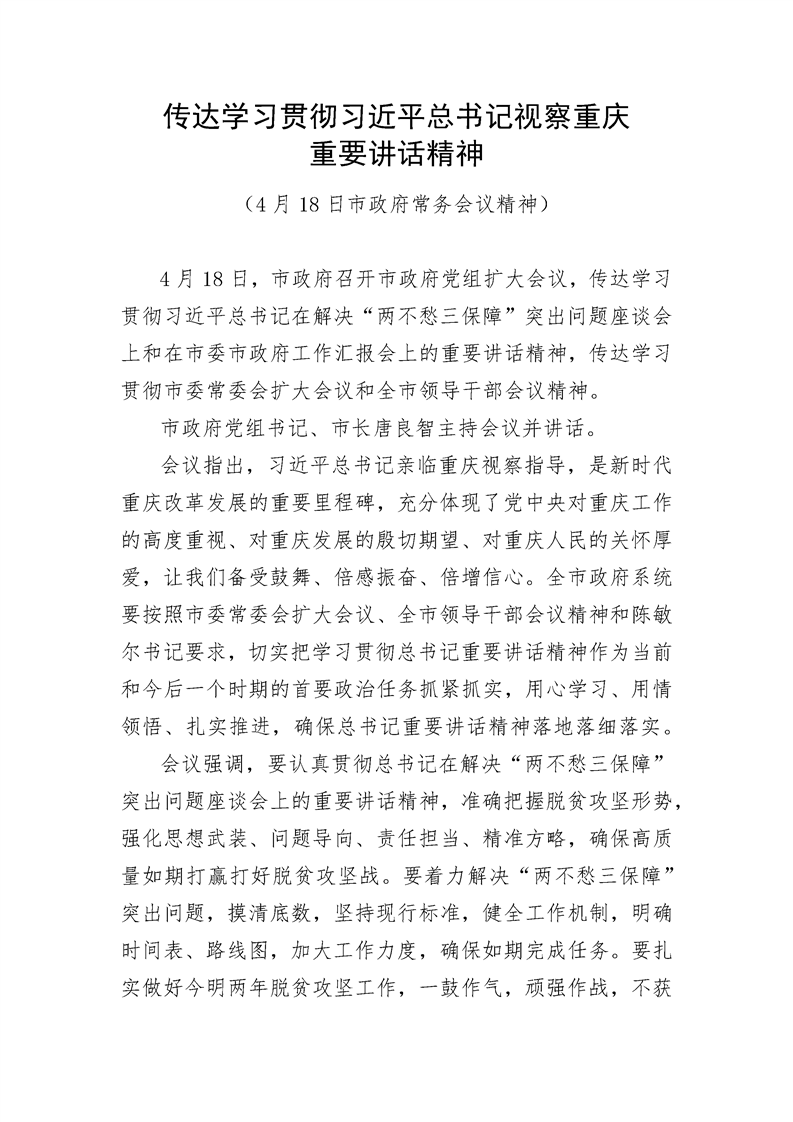 市政府常务会议传达学习贯彻习近平总书记视察重庆重要讲话精神