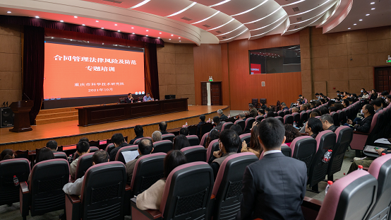 10月21日,凯发k8官网在院一期三楼报告厅组织召开全院法律合同知识培训会,特邀院法律顾问、重庆百君律师事务所高级合伙人周炜律师作《合同管理法律风险及防范》专题培训,会议由院纪委书记曾学东主持,院机关处室负责人、院属组织领导班子成员、各单位、各部门合同管理和经办人员等共计110余名干部职工参加学习。